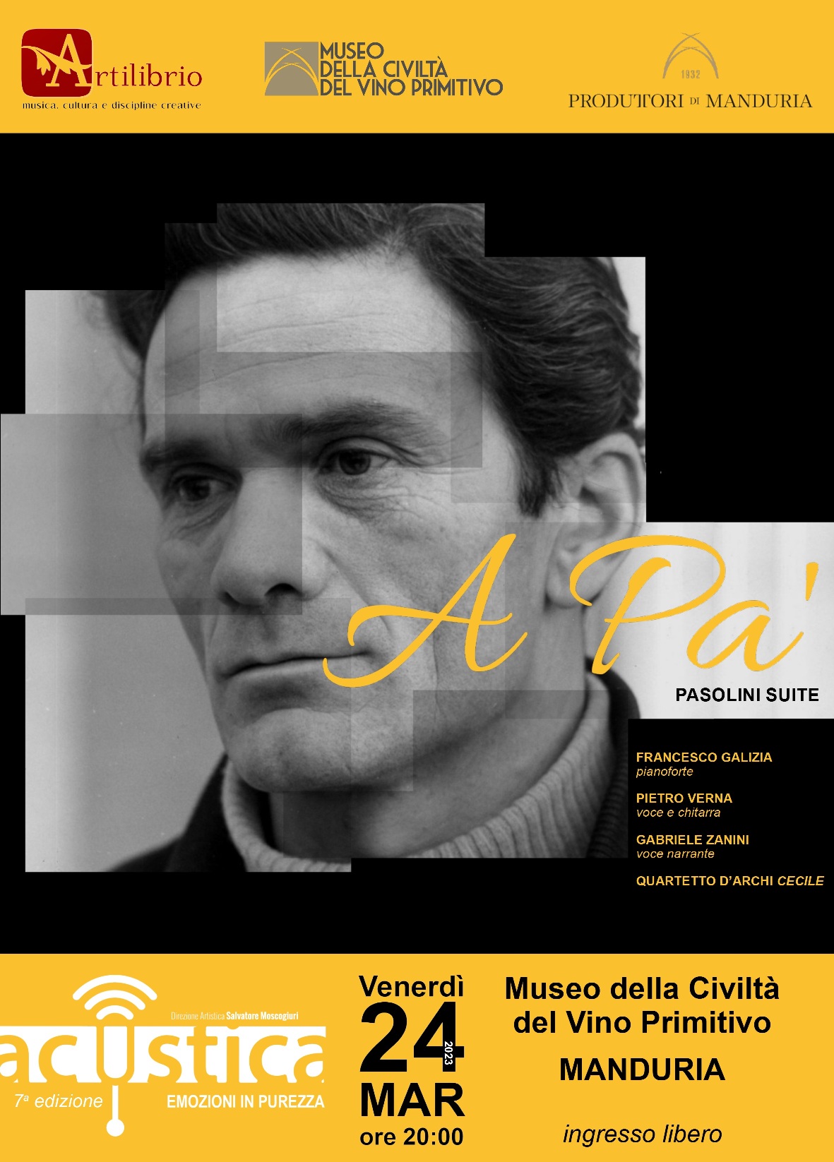 Un evento di grande effetto, tra teatro e musica, per ricordare uno dei più grandi e poliedrici intellettuali del ‘900 a poco più di cento anni dalla sua nascita. S’intitola “A Pa’ - Pasolini suite” lo spettacolo in programma venerdì 24 marzo al Museo della Civiltà del Vino Primitivo di Manduria, nell’ambito della 7a edizione della rassegna Acustica | emozioni in purezza.