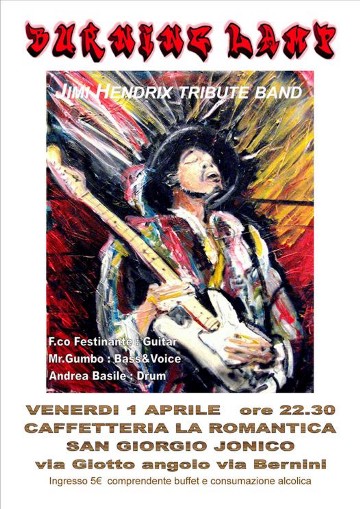 dell’uomo che ha rivoluzionato il modo di suonare la chitarra elettrica, c’è ancora tantissima gente che continua a comprare i suoi dischi ed emozionarsi davanti alle sue incredibili performance live. Venerdì 1 aprile, alle 22 e 30, presso la caffetteria “La romantica” a San Giorgio Jonico (via Giotto angolo via Bernini) “I Burning Lamp” saranno impegnati nell’audace ed elettrizzante spettacolo “Jimi Hendrix tribute band”, tentando di riproporre con la loro passione, dirompenza e arte d’improvvisazione, i live dell’eclettico chitarrista.Di sicuro non si tratterà della solita fredda fotocopia delle registrazioni in studio ma una vera live experience. In scaletta vi saranno brani storici come “Purple haze”, “Hey joe”, “Foxy lady”, ma anche un po’ di merce rara come “If 6 was 9”, “Third stone from the sun” e “Burning of the Midnight Lamp” per informare i meno esperti che dietro i brani più “commerciali” (sempre considerando il livello più alto dei canoni commerciali dell'epoca), ci sono una serie di brani che mettono in mostra la voglia di sperimentare e di rivoluzionare non solo il modo di suonare la chitarra, ma anche il modo di intendere la musica, uscendo dallo schema classico tanto amato dai produttori di concentrare tutto in 3 minuti!