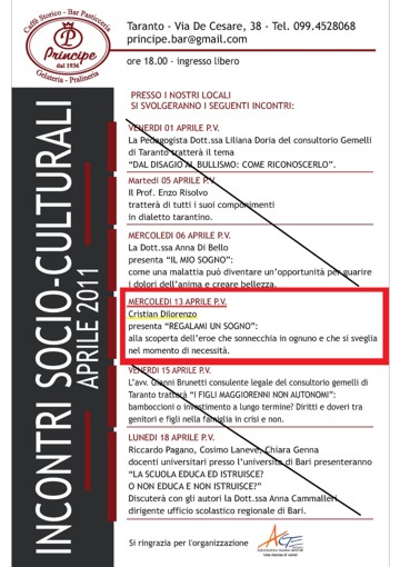 Il 13 aprile, presso il bar PRINCIPE, via De Cesare n.38 a TARANTO, ore 18.00 ci sarà la presentazione del romanzo d'esordio di Christian Dilorenzo.