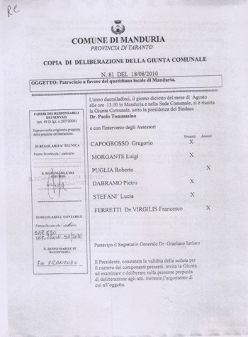 «Premesso che con nota n° 19.589 del 3 agosto del 2010, il direttore ed editore del quotidiano “La voce di Manduria” fa presente a questo civico ente che il giornale compie un anno dalla sua prima pubblicazione; che per tale occasione il direttore intende festeggiare l’evento presso la masseria “Li Grazioli” con l’esibizione di gruppi musicali, ballerini ed intrattenitori, aperto a tutti coloro che volessero partecipare; che a tale scopo chiede un contributo economico per le spese organizzative della manifestazione».