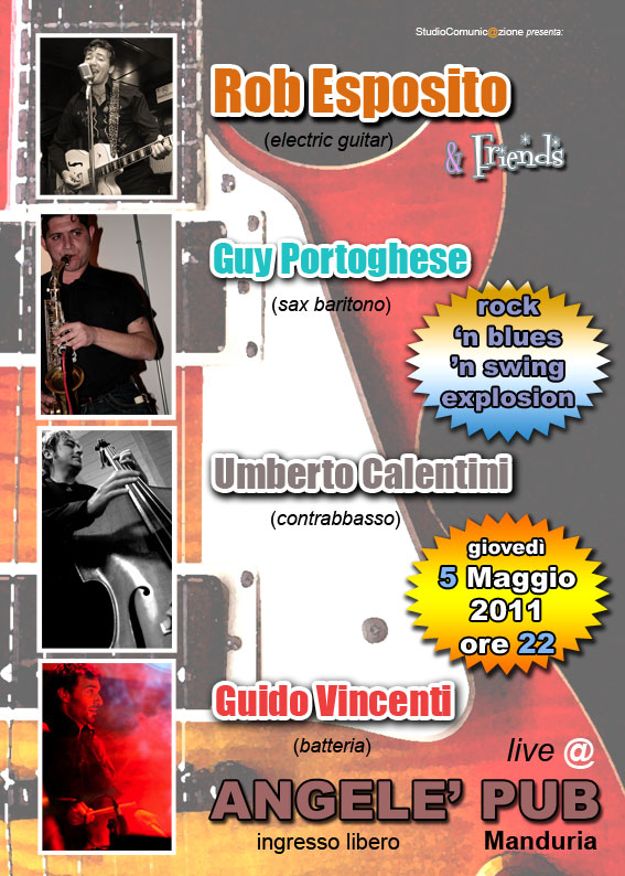 amanti della Black Music, una super-band capitanata da mister Rob Esposito (electric guitar) con tra i più grandi musicisti rock-swing-blues & roll di Italia, line up degli incredibili “Guy & Gli Specialisti”, l’incontenibile Guy Portoghese al sax baritono, l’acrobata del contrabbasso Umberto Calentini e una delle più dirompenti “drum machine” d’Italia, Guido Vincenti alla batteria.L’appuntamento è per giovedì sera all’Angelè di Manduria. L’ingresso è libero.