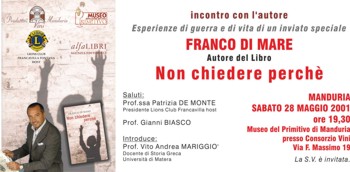 sabato prossimo, alle ore 19,30, nel Museo del Primitivo del Consorzio Produttori Vini di Manduria.Sarà presentato, alla presenza dell’autore, l’ultimo libro di Franco Di Mare, “Non chiedere perché”, che racconta le “esperienze di morte e di vita di un inviato speciale”.