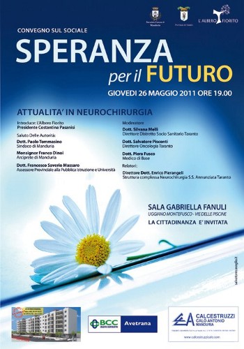 alle ore 19, presso la sala “Gabriella Fanuli” del Centro dei servizi per l’Agricoltura di Uggiano Montefusco.Il convegno, che è promosso l’associazione “L’albero Fiorito” e che gode del patrocinio del Comune di Manduria e della Provincia di Taranto, servirà per tracciare il punto sulle novità in neurochirurgia.