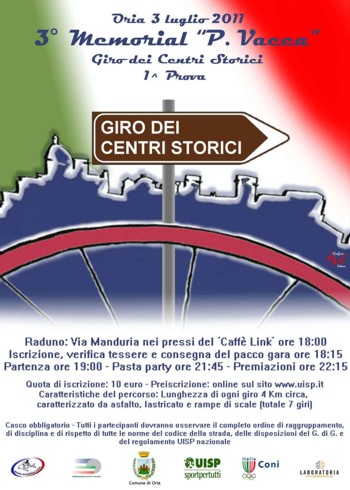 Domenica 03 luglio 2011 - Oria Ore 18: raduno presso via Manduria, 101 “LINK CAFE”; ore 18.15: iscrizione e verifica tessera, ritiro numeri di gara; ore 19: partenza ufficiale; ore 21 Arrivo previsto; ore 21.45: pasta party in piazza Manfredi; ore 22.15: premiazioni 1°/2°/3° assoluto, 1°/2°/3° di ogni categoria, premiazioni per la squadra più numerosa e altre premiazioni a sorpresa.