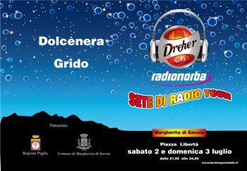 Dreher e Radionorba porteranno a Margherita due grandi artisti. Sabato ci sarà la salentina Dolcenera, reduce dal grandissimo successo del singolo “Il sole di domenica”, per settimane il brano più suonato in assoluto dalle radio italiane, fortunato apripista dell’album pop elettronico “L’evoluzione della specie”, che ha segnato il suo esordio alla batteria. Domenica, invece, tocca a Grido dei Gemelli Diversi, all’esordio da solista: il suo primo album si chiama “Io grido” ed è stato anticipato da due singoli, l’ultimo dei quali, “Fumo e malinconia”, è attualmente in rotazione radiofonia. Ai microfoni di Radionorba parlerà di questo suo lavoro, ma anche del disco a cui sta lavorando con i Gemelli, di prossima uscita.