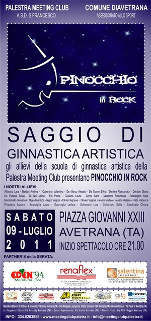 XXIII, ad Avetrana, avrà luogo il saggio artistico degli allievi di ginnastica artistica della palestra Meeting Club, che presenteranno lo spettacolo “Pinocchio in Rock”