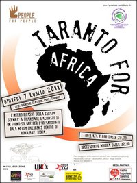 balneare Saint Bon avrà luogo l’evento promosso da “4people” “Taranto For Africa”.Sono previsti una grigliata e il servizio bar a partire dalle 20,30, nonché musica e spettacoli dalle 22. Si esibiranno: - Simba e il Mattino dei Maghi, Manduria; - Sixtynine, Grottaglie; - Terron Rebel Sound, Maruggio.