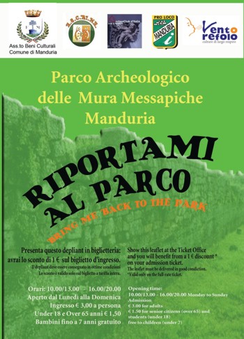 promozionale pensata dalle quattro associazione che per tutta l’estate si occuperanno di gestire il “Parco archeologico delle Mura Messapiche” di Manduria. Cercate in giro i volantini con la scritta “Riportami al Parco” e presentatelo in buone condizioni al book-shop all’ingresso del Parco. Riceverete uno sconto sul biglietto di ingresso.