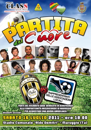serviranno al Comune di Maruggio per acquistare una nuova ambulanza da far utilizzare alle associazioni di soccorso locali..L’estate maruggese non riserva soltanto divertimento. Questa sera (sabato), c’è anche un’occasione per dimostrare la solidarietà. Lo stadio “Demitri” del centro maruggese ospiterà, a partire dalle 18,30, la partita del cuore. Nel rettangolo in erba sintetica di Maruggio si affronteranno la squadra Nazionale Artisti e una formazione composta da rappresentanti delle associazioni locali.