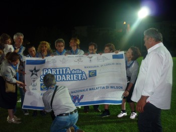 solidarietà che si è svolta nei giorni scorsi a Manduria, su iniziativa dell’associazione Free Music (di Franco Sporta Caputi e Salvatore Guerriero). In campo la Nazionale Artisti TV, che ha affrontato una rappresentativa di imprenditori, politici e altre autorità locali al fine di raccogliere i fondi da devolvere all’Associazione Nazionale Malattia di Wilson.
