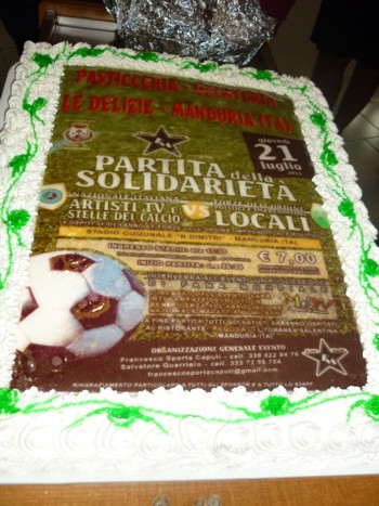 solidarietà che si è svolta nei giorni scorsi a Manduria, su iniziativa dell’associazione Free Music (di Franco Sporta Caputi e Salvatore Guerriero). In campo la Nazionale Artisti TV, che ha affrontato una rappresentativa di imprenditori, politici e altre autorità locali al fine di raccogliere i fondi da devolvere all’Associazione Nazionale Malattia di Wilson.In una nota, la Free Music ringrazia la Nazionale Artisti Tv (con il presidente dott. Osvaldo Bresciani che da anni partecipa, insieme ai suoi artisti) a queste iniziative per la beneficienza, e gli sponsor locali (Pietro Pedone, Eden