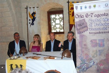 A dare il benvenuto è stata la dottoressa Emanuela Romanin che ha sottolineato il felice connubio tra il Castello e l’Associazione Pro Loco di Oria. Il Palio, che come di consueto viene offerto da Enti o Associazioni per celebrare alcune ricorrenze o sottolineare particolari temi, quest’anno sarà donato proprio dalla famiglia proprietaria del Castello di Oria, che intende così celebrare la riapertura al pubblico di questo gioiello del Medioevo pugliese legato alla figura e mito di Federico II, considerato uno dei manieri più belli di Puglia, visitabile fino a mezzanotte nei due giorni del Corteo e del Torneo. «Essere i custodi di questo gioiello - ha dichiarato la dottoressa Romanin - ci fa onore. Il castello però non è solo un bene monumentale da custodire, né si chiuderà in se stesso. Vogliamo renderlo un luogo attivo e grazie alla sinergia con la stessa Pro Loco e con altre Istituzioni possiamo mirare al raggiungimento di grandi obiettivi>>.