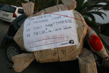 Cavalieri dell’Arneo, che aprivano il corteo di protesta), o con singolari altarini, trasportati per tutto il percorso, da Specchiarica a San Pietro in Bevagna. Con semplici t-shirt (come quelle, bianche, indossate dagli amministratori di Manduria), o con magliette blu (come quelle che hanno caratterizzato gli attivisti del Comitato spontaneo di Manduria). E persino dall’alto, con due ultraleggeri. Singolare, poi, l’ironia del rappresentante del Wwf, Francesco Di Lauro, il quale ha realizzato e appeso all’esterno della propria auto una tartaruga in carta, sulla quale, rifacendosi alla recente schiusa di uova di un esemplare di Caretta Caretta nella vicina contrada Capoccia di Campomarino, ha lanciato un eloquente messaggio al governatore Vendola: “Presidente, le prossime uova te le tiro direttamente in faccia – Tua Caretta Caretta”. Poi lo slogan che racchiude le ragioni della protesta: “Area protetta marina, altro che latrina!”.