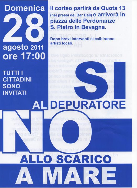 mobilitazione delle popolazioni contrarie allo scarico a mare dei reflui depurati del progettato depuratore consortile di Manduria e Sava, in attesa dell’incontro con l’assessore regionale Amati, che dovrebbe aver luogo il 23 settembre.Il Comitato di Manduria, dopo aver raccolto migliaia di firme durante le giornate dedicate ai festeggiamenti patronali, ha deciso di inviare una lettera al governatore pugliese Nichi Vendola, alla quale hanno allegato la petizione.