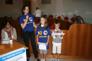 Nel corso dell’incontro sono anche intervenuti Arcangelo Durante, coordinatore dell’IdV di Manduria, Liliana Digiacomo, coordinatrice del comitato “No scarico a mare”, un cittadino di Pulsano (che ha parlato dell’emergenza che esiste in quella città), tre bambini (Rebecca, Riccardo e Davide), che hanno consegnato a Nicastro le 4.900 firme raccolte, e l’ambientalista Francesco Di Lauro («La Regione non può avere due pesi e due misure»).