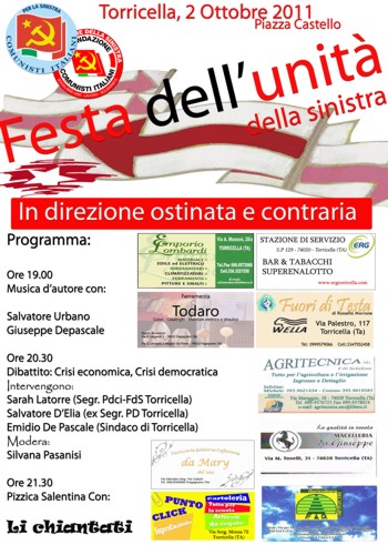 intrapreso, i Comunisti Italiani di Torricella organizzano la seconda edizione della “Festa dell’Unità della Sinistra”, che si svolgerà domenica 2 ottobre in piazza Castello.