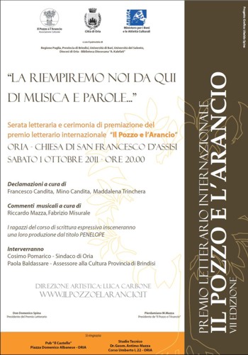 Francesco d’Assisi in Oria, l’associazione culturale “Il Pozzo e l’Arancio” presenterà la serata letteraria dal titolo “La riempiremo noi da qui di musica e parole”, cerimonia conclusiva del Premio Letterario Internazionale “Il Pozzo e l’Arancio”, giunto alla VII edizione.