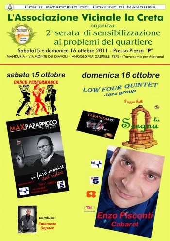 quartiere.A promuoverle è l’associazione “Vicinale La Creta”, che anche quest’anno, in piazza “P” (una piazza non ancora completata dal Comune di Manduria, che eccelle per la sua provvisorietà anche nella denominazione…), ha organizzato alcuni spettacoli, che serviranno a richiamare la gente del quartiere, ma non solo, e gli amministratori, per trascorrere alcune piacevoli ore assistendo agli eventi, ma anche per ricordare loro i tanti problemi di questo quartiere di periferia. Primo fra tutti quello degli allagamenti nei giorni di grande piovosità.