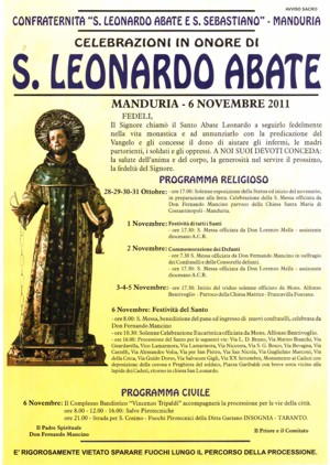 Il 6 novembre è invece il giorno dedicato alla festività di San Leonardo. Alle 8 la prima funzione religiosa, con la benedizione del pane e l’ingresso dei nuovi confratelli, celebrata da don Fernando Mancino. Alle 10,30 la solenne concelebrazione Eucaristica, officiata da mons. Alfonso Bentivoglio. Alle 16 avrà inizio la processione (accompagnata dal complesso bandistico “Vincenzo Tripaldi”) fra le principali vie della città. Infine alle 21, sulla strada per San Cosimo, i fuochi pirotecnici chiuderanno i festeggiamenti.