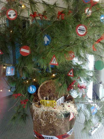 alunni delle scuole elementari alla segnaletica stradale.A lanciare l’iniziativa, per questo periodo di festività Natalizie, è il Corpo della Polizia Municipale di Manduria. Nella propria sede di corso XX Settembre, quasi di fronte la chiesa di Santa Maria, la responsabile del Corpo, la tenente Anna Rita Morleo, e i suoi agenti hanno deciso di addobbare il proprio albero di Natale con le classiche palle colorate, bensì con tanti segnali in miniatura (come si può anche vedere dalla foto).