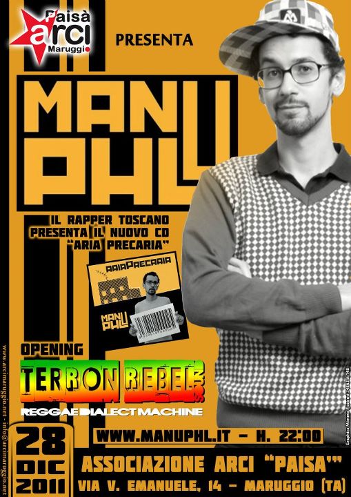 presenterà questa sera (mercoledì), nella sede dell’associazione Arci “Paisà” di via Vittorio Emanuele, il suo ultimo lavoro “Aria Precaria”. Insieme a lui si esibirà il gruppo composto quasi interamente da artisti maruggesi “Terron Rebel Sound”.Manu Phl è un rapper atipico, rappresentante di un nuovo modo di concepire l’hip-hop, lontano dai clichè per sonorità, testi e look.