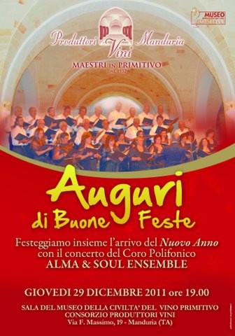 sereno e felice Natalee Vi invita a festeggiare l’arrivo del Nuovo Anno con il Concerto del Coro PolifonicoAlma & Soul Ensemble, diretto dal maestro Salvatore Moscogiuri, e con il soprano Valeria Lombardi.L’appuntamento è per domani (29 dicembre), presso la Sala del Museo della civiltà del vino Primitivo, alle ore 19