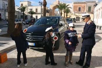 natalizie a Manduria.Su iniziativa della responsabile del Corpo della Polizia Municipale, la tenente Annarita Morleo, alcuni alunni delle tre scuole elementari di Manduria affiancano i vigili del posto in una simbolica operazione di controllo del traffico nel centro cittadino e della regolarità dei parcheggi.