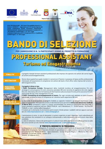 assistente professionale, specificatamente in imprese operanti nei settori tustico ed enogastronomico. È l’opportunità che offre il corso gratuito denominato “Professional Assistant - Turismo ed Enogastro-nomia”, che si terrà a Manduria da marzo a ottobre 2012, presso la Scuola Agricola “Nicola De Bellis” di via San Gregorio Magno 1 (Opera Salesiana “Villaggio del Fanciullo”).Il percorso formativo, organizzato da SMILE Puglia nell’ambito del POR. FSE PUGLIA 2007-2013 Asse II Occupabilità, è rivolto a 16 donne maggiorenni, residenti in provincia di Taranto, disoccupate o inoccupate e con basso profilo professionale, interessate all’acquisizione di competenze specifiche per la gestione di mansioni di ufficio in imprese appartenenti ai settori citati.