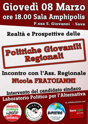 su scala regionale che locale: introdurrà l’argomento Veronica De Marco, con una relazione sullo stato delle politiche giovanili nel paese di Sava, seguirà l’intervento di Fratoianni e le testimonianze dirette di giovani che hanno realizzato i propri progetti grazie ai bandi regionali ed alle opportunità che una lungimirante e concreta gestione di questo settore può offrire loro.Interverranno anche il candidato alle primarie dello scorso 4 marzo, Enrico Consoli e il neo eletto candidato sindaco del Laboratorio Ivano Decataldo.