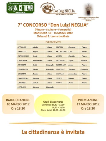 Abate in Manduria, avrà luogo l’inaugurazione del 7° Concorso “Don Luigi NEGLIA” ( Pittura - Scultura - Fotografia). L’esposizione delle opere durerà sino al 16 di marzo p. v..