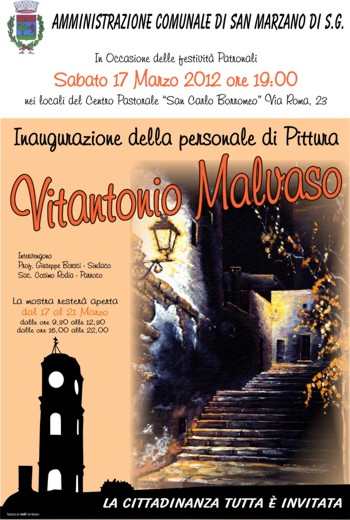 una serie di iniziative artistiche e culturali miranti a promuovere gli artisti della cittadina. In quest’ambito si inserisce una personale di pittura patrocinata dal comune di San Marzano che sabato 17 Marzo alle ore 19.30 verrà inaugurata presso i locali della biblioteca parrocchiale sita in via Roma alla presenza del Sindaco di San Marzano e del parroco don Cosimo Rodia. L’artista locale Vitantonio Malvaso esporrà le proprie tele ispirate alle tradizioni agricole e culturali della nostra terra. Artista autodidatta V. Malvaso ha collaborato in varie occasioni attraverso i suoi dipinti ad iniziative culturali del territorio. Famoso è il ritratto da lui realizzato al compianto Don Franco Venneri deceduto nell’Ottobre 2011 che è stato utilizzato dalla Biblioteca parrocchiale come copertina del calendario 2012, dedicato interamente alla figura del parroco scomparso . La mostra alla quale tutta la cittadinanza è invitata resterà aperta fino al 21 Marzo 2012.