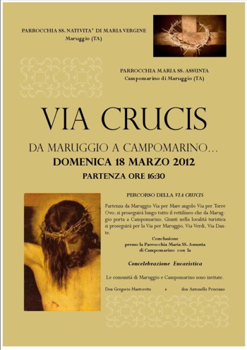 16,30 le comunità parrocchiali di Maruggio e Campomarino si incontreranno in via Mare, angolo via Torre Ovo a Maruggio, per pregare con la più importante delle pratiche religiose quaresimali: la Via Crucis.
