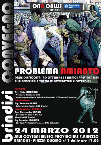 delle gravi patologie riportate da lavoratori e familiari esposti direttamente o indirettamente all’amianto, che ormai prescindono dai settori di impiego - dagli ex dipendenti della Eternit che produceva manufatti di cemento amianto, ai lavoratori della gomma, vedi Bridgestone, Good Year, Pirelli, dove l’amianto crisotilo veniva usato nel ciclo produttivo, agli uomini a bordo delle navi dove l’amianto veniva utilizzato per la coibentazione – e dalle attività svolte, l’Osservatorio Nazionale Amianto farà il punto della situazione il 24 marzo prossimo nel corso di due incontri alla presenza degli organismi e dei dirigenti nazionali dell’associazione: il presidente Ezio Bonanni, l’on.le Pierfelice Zazzera, parlamentare e membro del Comitato Tecnico Scientifico, Gaetano Veneto, ordinario di Diritto del Lavoro presso l’Università di Bari e membro del Comitato Tecnico Scientifico, l’on.le Lorenzo Nicastro, assessore alla Qualità dell’Ambiente della Regione Puglia.A margine del convegno saranno tracciate le linee e le strategie future dell’associazione, sia a livello nazionale sia nello specifico in Puglia. Modera Lucia Schinzano direttore del web magazine Ambient&Ambienti.