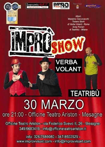 la rappresentazione della “Cavalleria Rusticana” di Giovanni Verga e musiche di Piero Mascagni a cura della Compagnia Stabile Amici del Teatro diretta da Jenny Ribezzo, le OffiCine Teatro Ariston di Mesagne proseguono con i grandi appuntamenti teatrali.Venerdì 30 Marzo 2012 a partire dalle ore 21, OffiCine Teatro ARISTON Mesagne presenta IMPROSHOW, uno spettacolo interamente dedicato all’improvvisazione con la presenza dei “VERBA VOLANT” Massimo Ceccovecchi e Tiziano Storti, reduci dal recente successo televisivo targato Mediaset “ITALIA’S GOT TALENT” su Canale 5 edAndy Ferrari di TEATRIBU’.