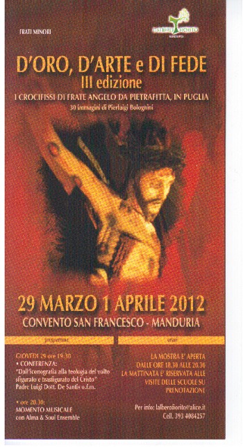 nella chiesa di San Francesco a Manduria sul tema “I crocifissi di frate Angelo da Pietrafitta in Puglia” all’interno della terza per edizione di “D’oro, d’arte e di fede” a cura dell’ass.ne L’albero Fiorito di Manduria e dei Frati Minori.La mostra, con 30 immagini di Pier Luigi Bolognini, rimarrà aperta sino a domenica 1 aprile, dalle 18 e 30 alle 20 e 30.