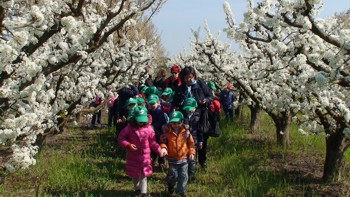 A seguire i bambini hanno potuto guardare da vicino un frutteto, nel caso specifico un impianto di susine in fiore varietà Tc Sun di pezzatura grossa a polpa gialla con la buccia giallo-dorata e con un nocciolo piccolissimo, la cui raccolta avviene a fine luglio i primi di agosto; la varietà Angeleno di pezzatura grossa a polpa gialla con la buccia di colore viola scuro che si raccoglie a fine settembre i primi di ottobre e può essere conservata in frigo fino a Natale.
