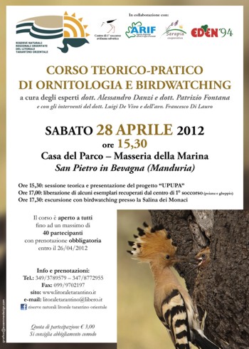 Regionali Orientate del Litorale Tarantino, in collaborazione con il Centro di 1° soccorso avifauna selvatica e la Cooperativa Serapia, organizzano il 1° Corso Teorico-Pratico di ornitologia e birdwatching, per il riconoscimento degli uccelli selvatici presenti nell’area protetta. L’evento prevederà una sessione teorica all’interno della Casa del Parco, presso la Masseria della Marina (San Pietro in Bevagna - Manduria), durante la quale gli esperti dott. Alessandro Danzi e dott. Patrizio Fontana del Centro di 1° soccorso illustreranno le caratteristiche peculiari delle specie dell’avifauna locale e le loro “curiose” strategie di sopravvivenza e presenteranno il progetto sperimentale “Upupa”.