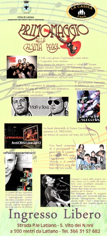 maggio un maxi concerto, ad ingresso libero, a cui parteciperanno le migliori band e solisti del territorio tra cui i Mar Y Soul, The Black Spot, il cantautore Dario Spagnolo, il gruppo folk La Resistenza, il giovanissimo batterista Giovanni Facecchia, Le Risonanze Folk e Raffaele Passiante band.