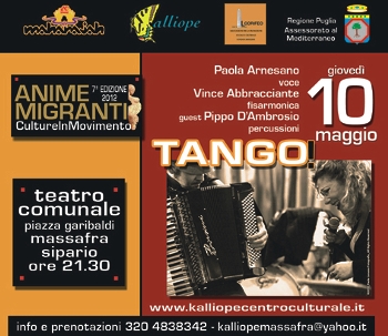 migranti 2012, organizzato dall’Associazione Culturale Maharajah e dal Centro Culturale Kalliope con TANGO, Giovedì 10 maggio ore 21,30, presso il Teatro Comunale (p.zza Garibaldi) a Massafra.