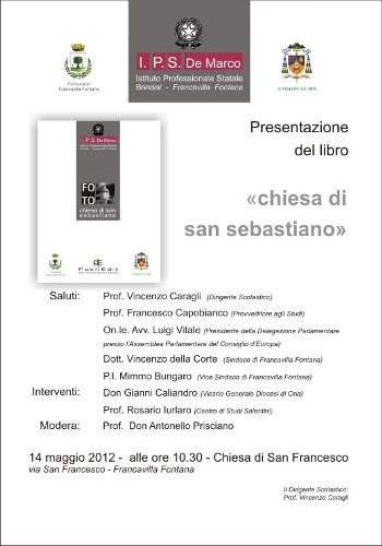 Francavilla Fontana, verrà presentato il libro “Chiesa di San Sebastiano”.L’opera, patrocinata dalla Diocesi di Oria e dal Comune di Francavilla, raccoglie una serie di foto realizzate dai ragazzi dell’istituto professionale cittadino “De Marco”, durante un corso grafico-pubblicitario tenuto dal prof. Giuseppe Lombardi.
