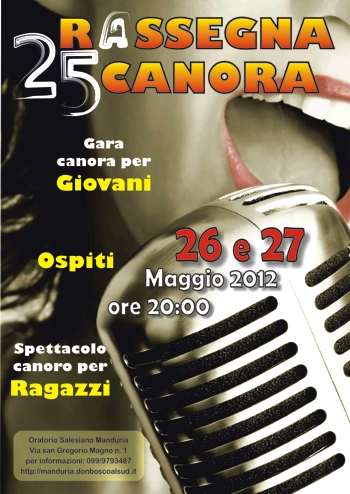 organizza, nei giorni 26 e 27 maggio, la 25ª edizione della Rassegna Canora, tradizionale manifestazione musicale. Ci sono ben 25 anni di storia alle spalle e quest’anno lo evidenzieremo attraverso varie iniziative che ci aiuteranno a ripercorrere le tappe più significative di questa manifestazione. Verrà allestita, infatti, una mostra fotografica con alcune foto delle passate edizioni e verrà proiettato un video commentato da coloro che hanno reso possibile la realizzazione di tale iniziativa nel corso degli anni.