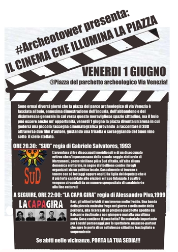 archeologico di via Venezia è lasciata al buio, ennesima dimostrazione dell’incuria, dell’abbandono e del disinteresse generale in cui versa questo meraviglioso spazio cittadino.Ma il buio può essere anche un’opportunità, venerdì 1 giugno la piazza diventa un’arena in cui godersi una piccola rassegna cinematografica provando a raccontare il SUD attraverso due film d’autore, gustando una frisella o sorseggiando del buon vino sotto il cielo stellato.