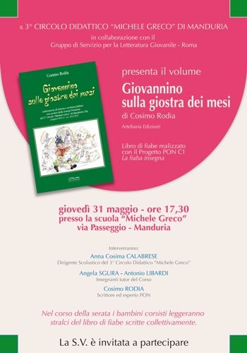 Circolo “M. Greco”, il libro Giovannino Sulla Giostra Dei Mesi, di Cosimo Rodia, ed. Artebaria, scritto dai bambini di classe terze della scuola Primaria, nel Progetto PON La fiaba insegna.L’iniziativa si è realizzata in collaborazione con il Gruppo di Servizio per Letteratura Giovanile (Roma), l’Associazione L’Aquilone (Bari), la Cattedra di Letteratura per l’infanzia dell’Università del Salento.