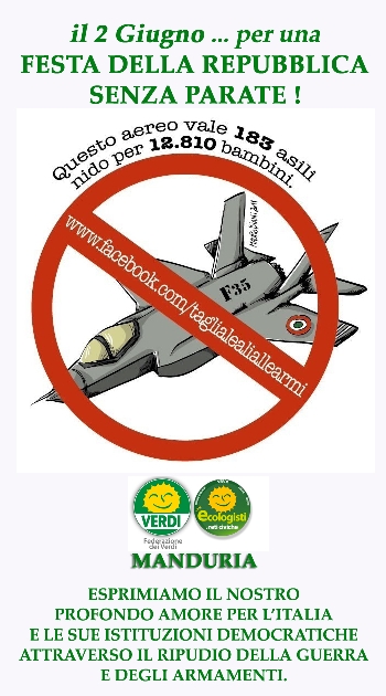 I Verdi Ecologisti di Manduria esprimono il proprio profondo amore per l’Italia e le sue istituzioni democratiche attraverso il ripudio della guerra e degli armamenti.