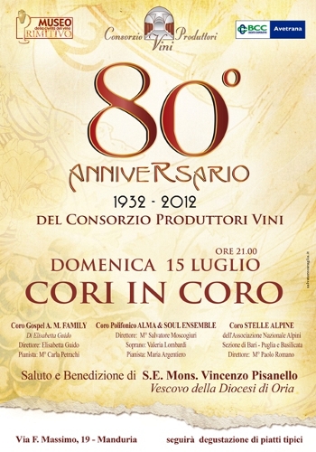 Vini nacque il 9 luglio 1932 grazie a 15 piccoli, illuminati vignaioli, che intuirono le grandi potenzialità del vitigno principe delle loro terre: il Primitivo.La storica Cantina vuole celebrare l’80° Anniversario non solo con i suoi 400 soci, ma anche con i tanti amici che da sempre sono al fianco di quella che è divenuta, in ottanta anni, una delle più rappresentative realtà imprenditoriali in campo enoico nel meridione.