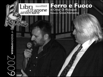 due scrittori manduriani Giuse Alemanno e Omar Di Monopoli per la presentazione del secondo romanzo di quest’ultimo nell’ambito del Premio “Libri a Trazione Anteriore”, rassegna arrivata alla quarta edizione e curata dalla Biblioteca Provinciale e dall’associazione BookBrothers, in collaborazione con la Casa Circondariale della Capitanata.Proprio all’interno della struttura penitenziaria, infatti, i due narratori nostrani hanno incontrato un gruppo di detenuti del reparto speciale 41 per discutere attorno al romanzo FERRO E FUOCO (Ed. ISBN Il Saggiatore), prima della presentazione serale del medesimo al pubblico del Café della Biblioteca. Il libro, sorta di western corale ambientato proprio nelle assolate terre del Gargano, risulta tra i finalisti del prestigioso concorso assieme ai testi di scrittori illustri come Marco Mancassola con La vita erotica dei superuomini (Rizzoli), Filippo Bologna con Come ho perso la guerra (Fandango), Nada Malanima con Il mio cuore umano (Fazi) e Anilda Ibrahimi con Rosso come una sposa (Einaudi).