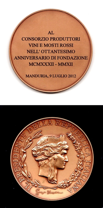 giunto direttamente dal presidente della Repubblica, Giorgio Napolitano: una medaglia, attraverso la quale il Capo dello Stato esprime un “cordiale saluto e augura buon lavoro”.A pochi giorni dai festeggiamenti per un traguardo prestigioso, il Consorzio Produttori Vini di Manduria, una delle “culle” del Primitivo di Manduria doc, ecco il dono che consacra una struttura che ha scritto la storia dell’enologia nella città messapica.