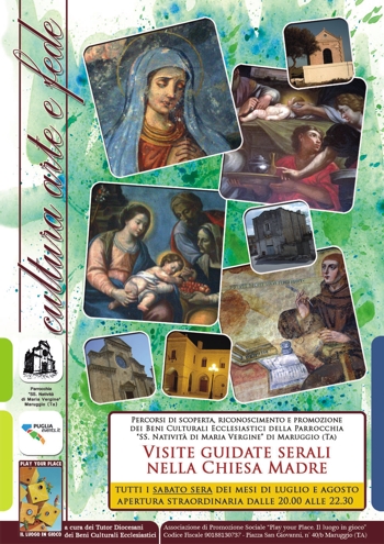 2012, tutti i sabato sera i Tutor Diocesani dei Beni Culturali Ecclesiastici – facenti parte dell’A.P.S. “Play your Place. Il luogo in gioco” di Maruggio – sono a disposizione di quanti vorranno essere accompagnati alla scoperta delle meraviglie storico-artistiche custodite nella chiesa Madre, che resterà aperta ben oltre l’orario abituale, dalle 20.00 alle 22.30.I Tutor, inoltre, sono disponibili a guidare i visitatori in Chiesa Madre e presso l’ex Convento dei Frati Osservanti di Maruggio (chiesa e chiostro) anche durante i giorni della settimana.