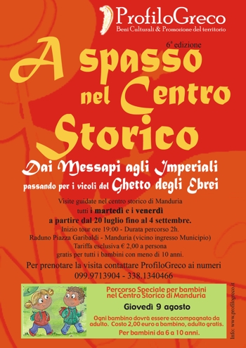 guidate, ogni martedì e venerdì sera accompagnati in “A Spasso nel Centro Storico”.A far scoprire gli aspetti meno conosciuti del borgo antico della città messapica ci pensa ProfiloGreco, l’agenzia specializzata nella valorizzazione e nella promozione delle risorse del territorio, che opera per far conoscere aspetti noti e meno noti dei beni culturali.