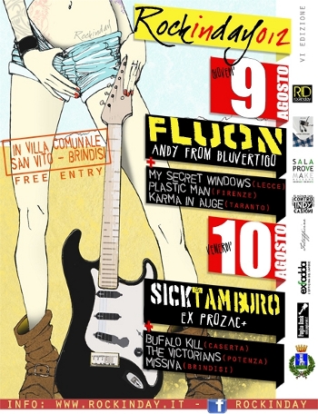 Promette scintille il Rockinday 2012: anche quest’anno si è registrata una notevole partecipazione, con ben 67 band iscritte, vogliose di partecipare alla sesta edizione della manifestazione e di dividere il palco con i Fluon, il nuovo progetto artistico nato dal genio di Andy Fumagalli (ex Bluvertigo), e Sick Tamburo, la nuova formazione dei Prozac +. Il 9 agosto, prima dell’atteso concerto dei Fluon, la musica dei My secret windows (Lecce), Plastic Man (Firenze) e Karma in Auge (Taranto). Il 10 agosto invece, che si chiuderà con il live dei Sick Tamburo, vedrà protagonisti i Bufalo Kill (Caserta), The Victorians (Potenza) ed i Missiva (Brindisi).